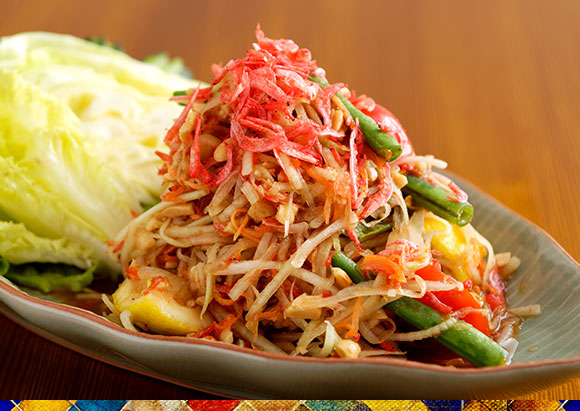シャキシャキ食感の青パパイヤにはビタミンやミネラルが豊富に含まれており、 タイでも人気の定番商品。 唐辛子のピリッとした辛さが効いていて、お酒との相性も抜群です。