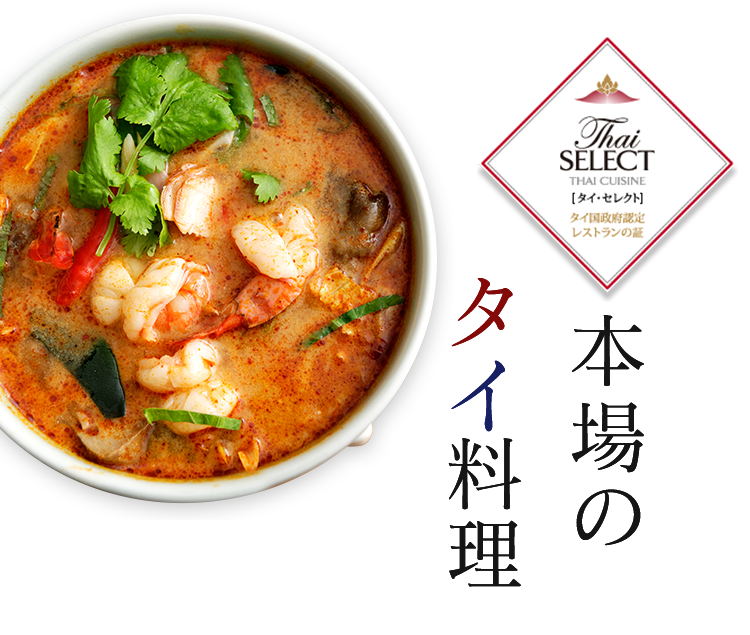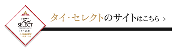 当店は、タイ国商務省「タイ・セレクト」に認定されています。これは、本場のタイ料理と変わらぬ美味しさを楽しめるお店に贈られる認定証です。素材や調味料からタイのものにこだわり、調理法や味付けも本場さながらに仕上げる逸品の数々。当店ならではのタイ料理を、ぜひご賞味ください。