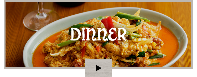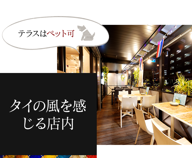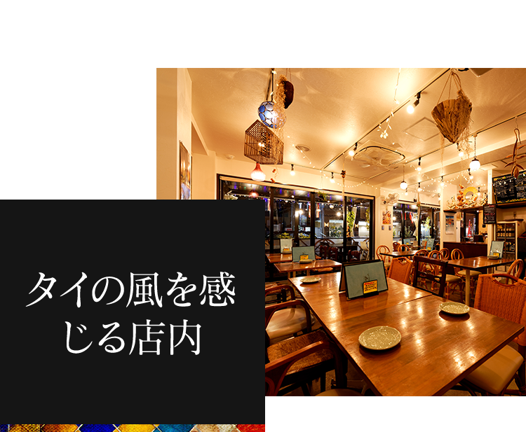 扉を開けるとまるで現地を訪れたかのような情緒ある世界が広がります。タイの小物やインテリアを散りばめた店内は、テーブル席をはじめ、小上がりの個室席やテラス席などがあり、居心地の良い空間です。シーンに合わせて、お好きな席をご利用ください。